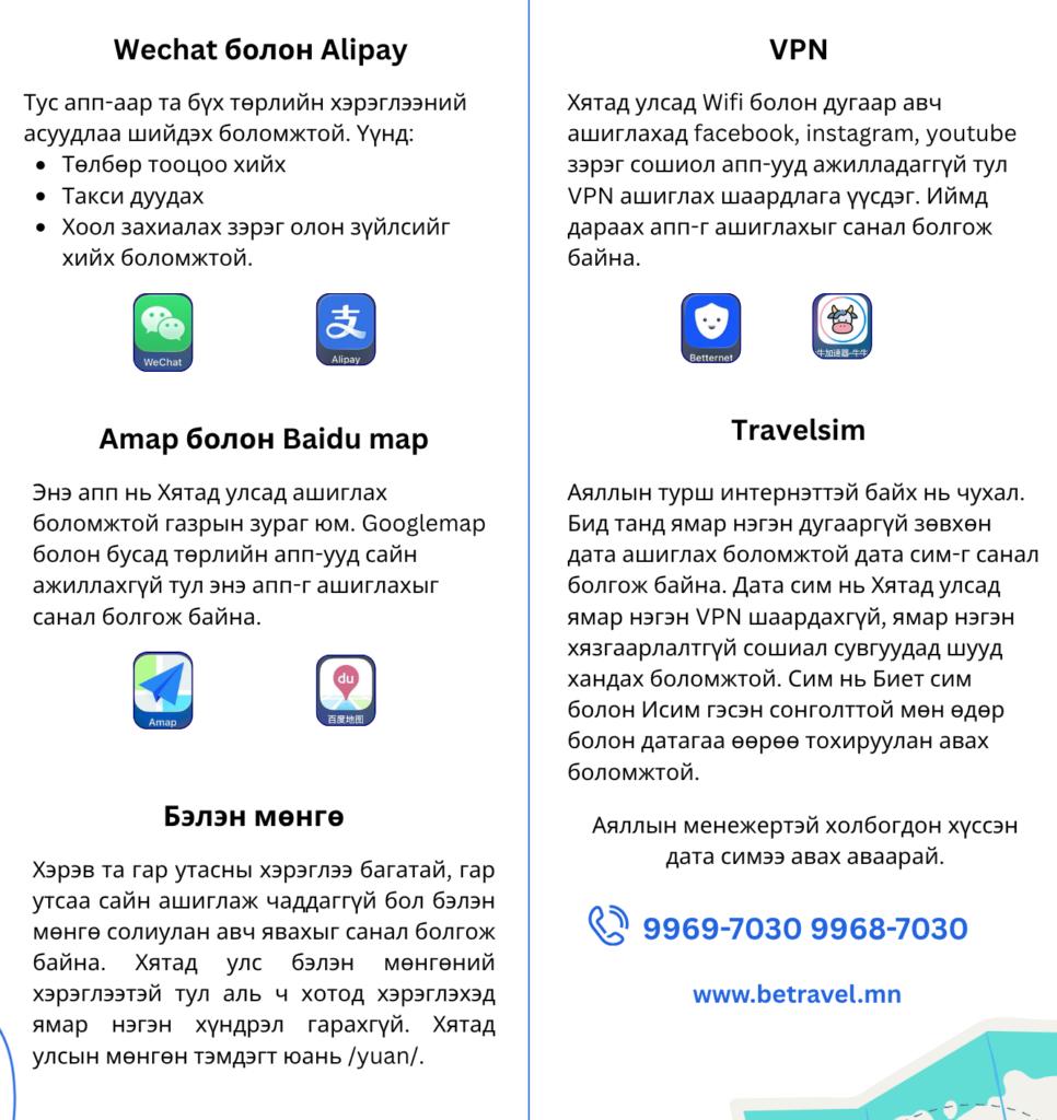 • Бүх аялагчид WECHAT-тай байх хэрэгтэй, аяллын явцад хөтчийн зүгээс мэдээлэл өгөх, нэгдсэн мэдээлэл солилцох үед ашиглана.